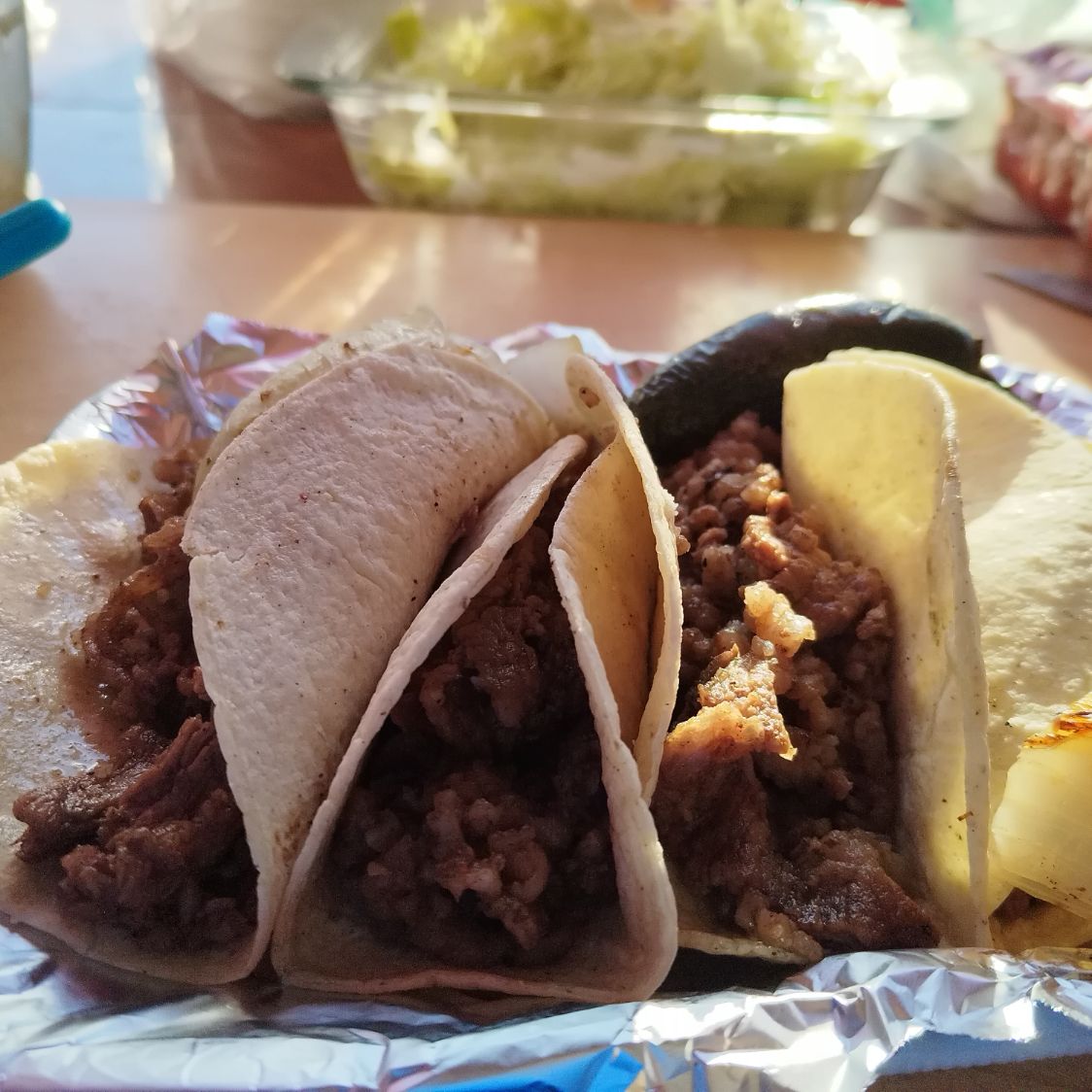 Doble Tortilla de Maiz (tortilla normal) con carne asada, gratinada de queso acompañada de cebolla asada y salsas.