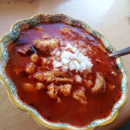 Tortilla de harina doblada a la mitad con carne asada, queso gratinado, acompañada de cebolla asada y salsa.
