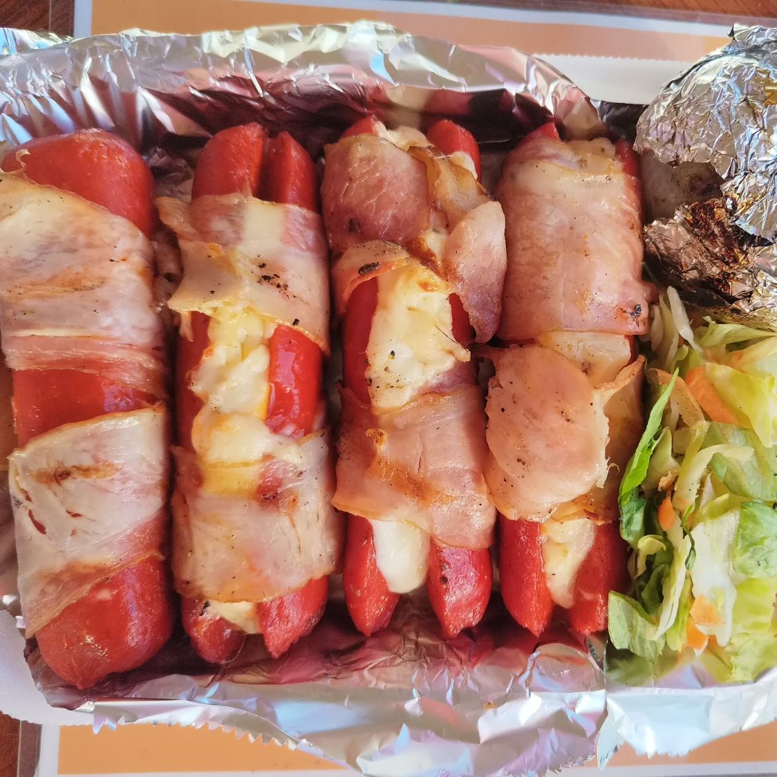 4 Salchichas Asadas rellenas de queso envueltas de Tocino