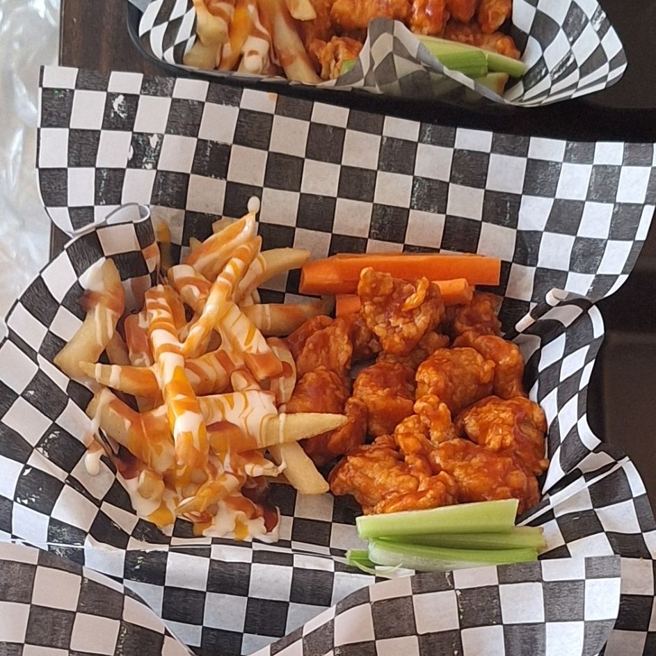 BONELES EN SALSA BBQ AOMPAÑADO DE RANCH Y VEGETALES