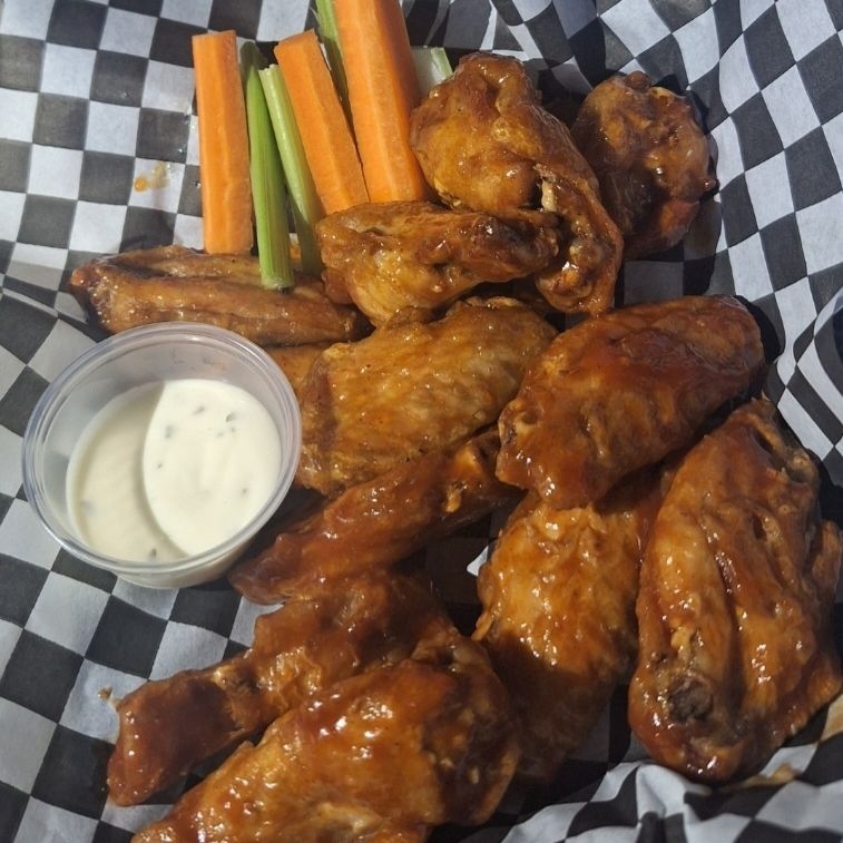 ALITAS BAÑADAS EN SALSA BBQ ACOMPAÑADA DE RANCH Y VEGETALES