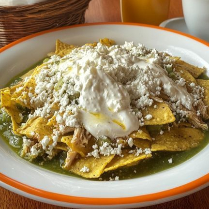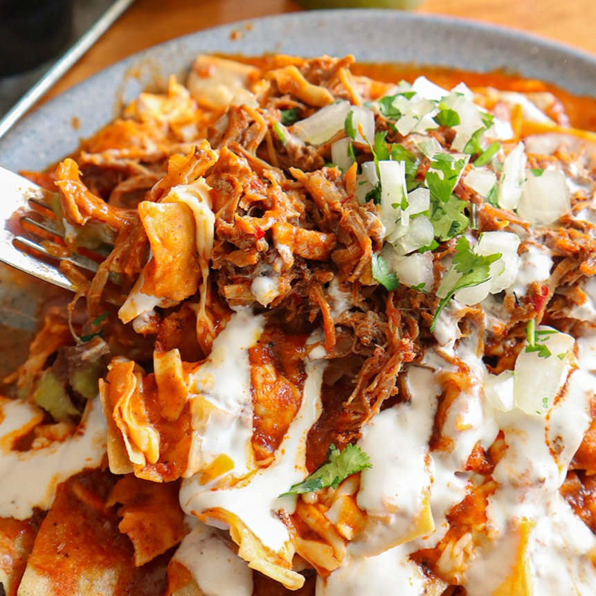 Tradicionales chilaquiles de maíz en salsa tatemada al estilo rancho, coronados con chicharrón prensado, decorados con queso, crema y cebolla encurtida, acompañados de frijolitos colorados.