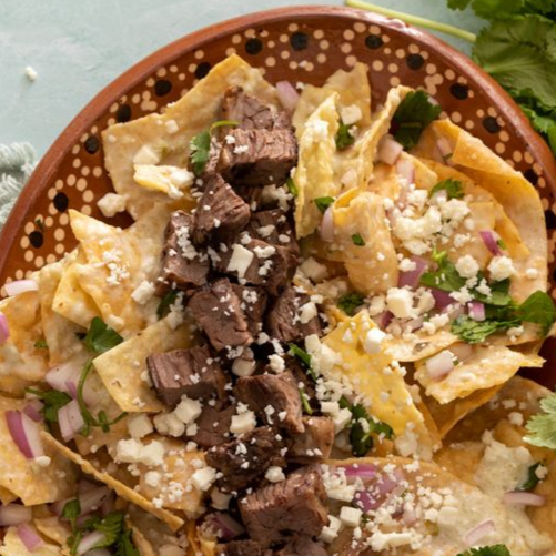 Tradicionales chilaquiles de maíz en salsa picocita verde, coronados con bistec y pico de gallo, decorados con queso, crema y cebolla encurtida, acompañados de frijolitos colorados.