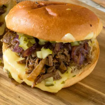 Deliciosa hamburguesa en pan brioche con mantequilla, aderezo de la casa y carne adobada, tocino, salsa de aguacate y chips.
