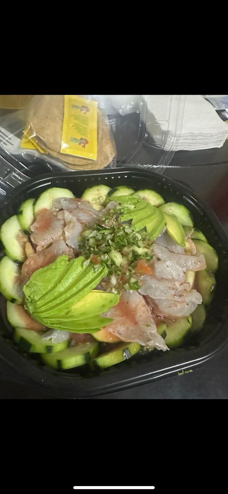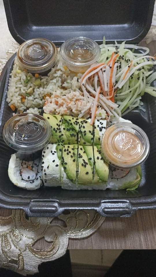 1 Rollo a elegir (12 pzas), acompañado con aguacate, queso crema y tampico, 1/2 orden de arroz mixto, 1/2 orden de ensalada de pepino y surimi.