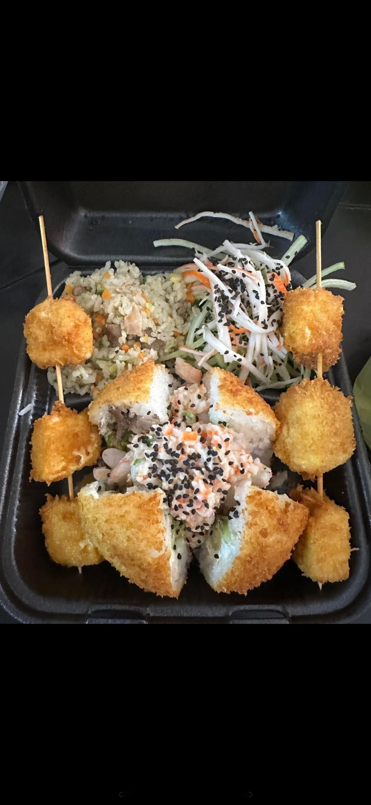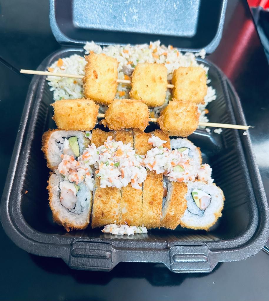 Incluye 1 rollo a elegir, orden de yakimeshi mixto, 2 kusiage de queso.