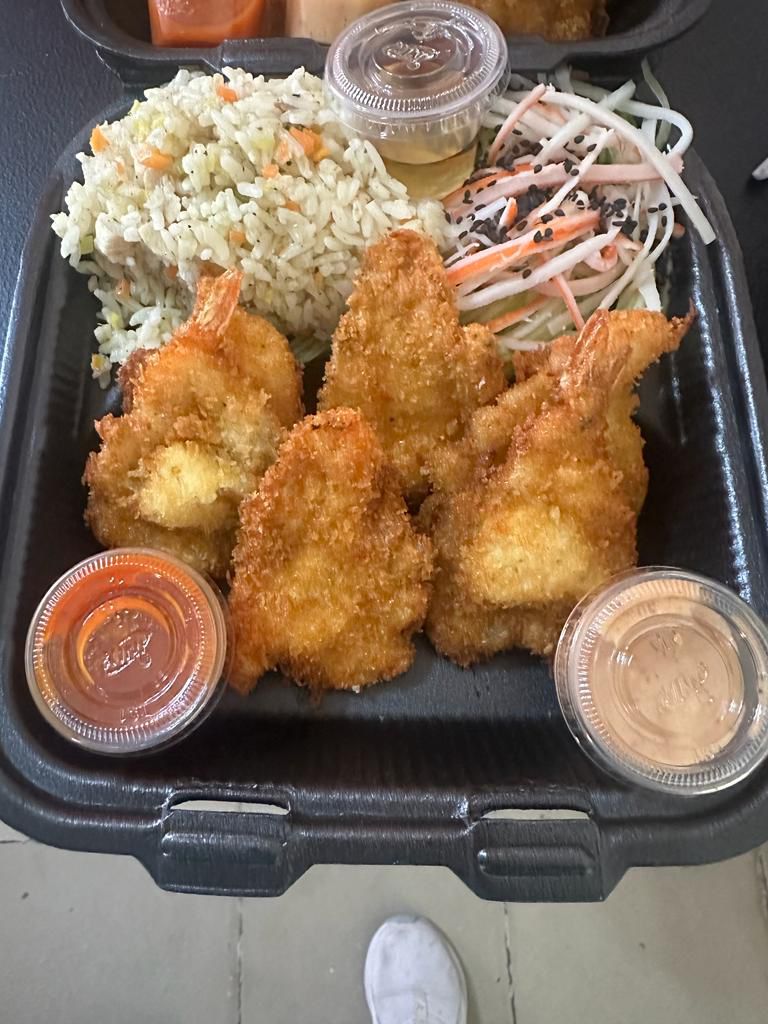 6 Camarones empanizados rellenos de queso crema, 1 orden de arroz mixto.