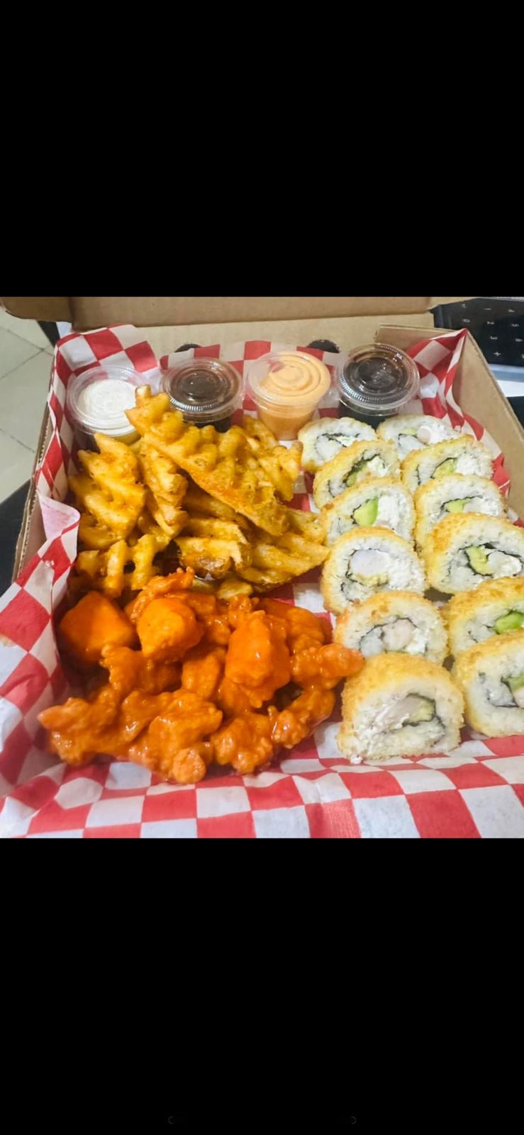2 Rollos de sushi (frío o empanizado de camarón, res o pollo), 2 ordenes de alitas o boneless, 1/2 orden de papas, 4 aderezos, salsas (soya, anguila, chipotle), para 2 a 3 personas. .