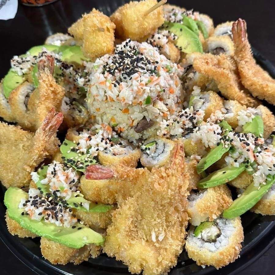 1 Rollo a elegir (12 pzas), acompañado con aguacate, queso crema y tampico, 3 camarones empanizados rellenos de queso crema, 1/2 orden de arroz mixto, 1/2 orden de ensalada de pepino y surimi.