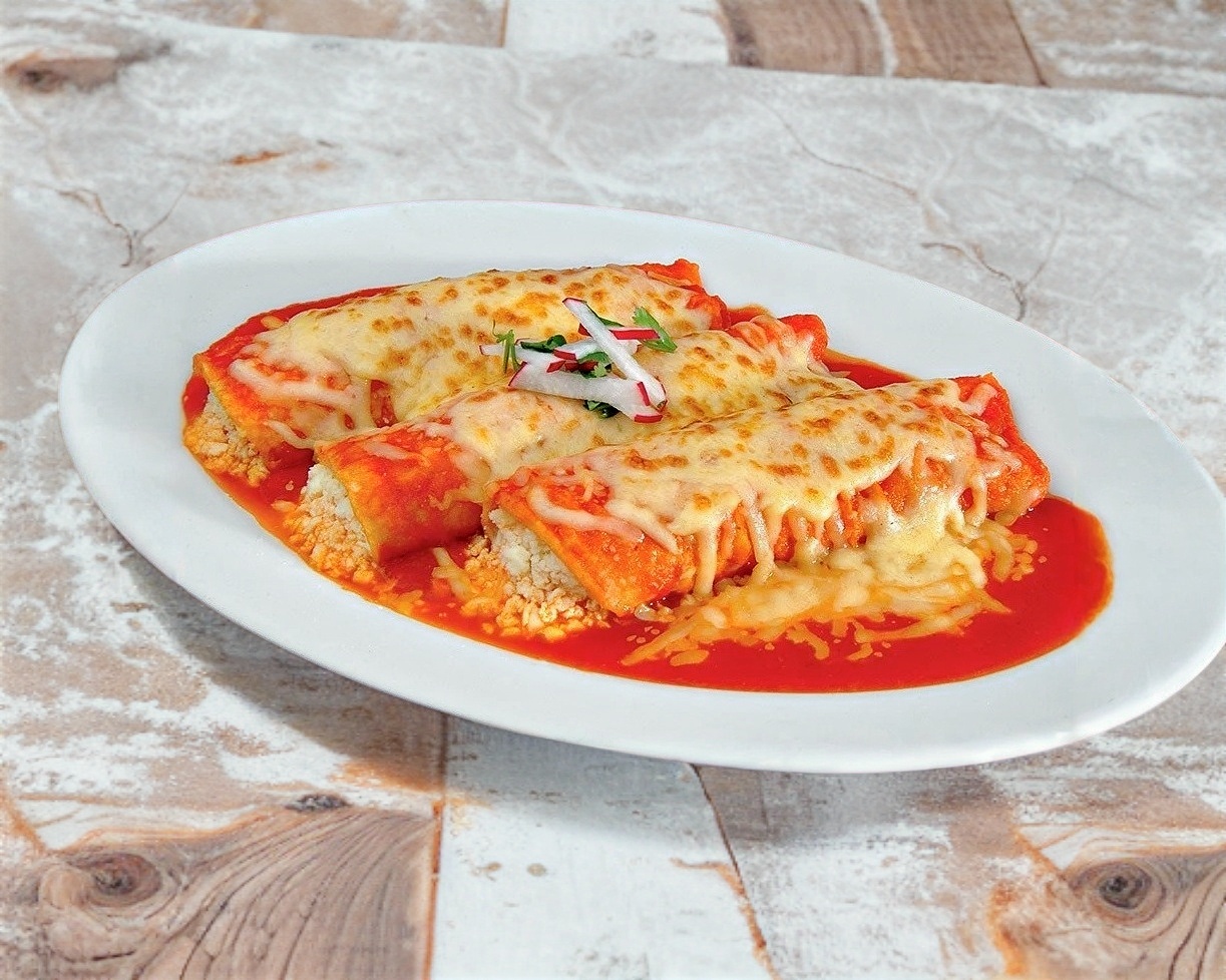 Platillo Principal de 3 enchiladas rojas o verdes, con dos guarniciones
