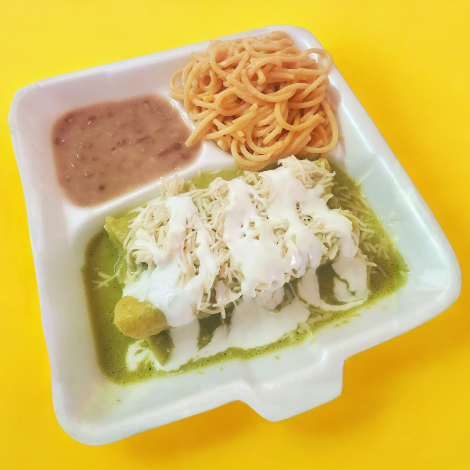 4 Enchiladas suizas o rojas bañadas en nuestras deliciosas salsas y acompañadas de arroz blanco y frijoles refritos