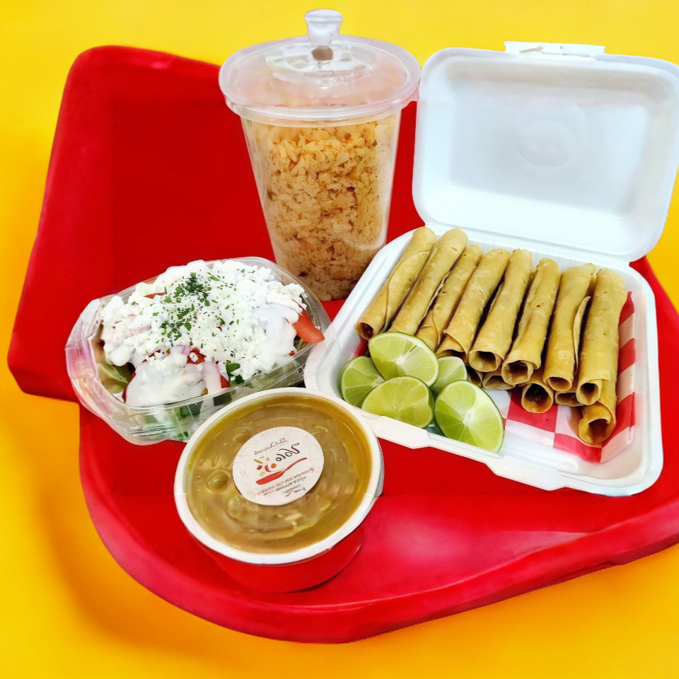 Flautas Surtidas*16 pollo y Res + Arroz 1 Lt*1 + 1 Lt Ensalada Verde (Panela y Crema)*1 salsas y limones