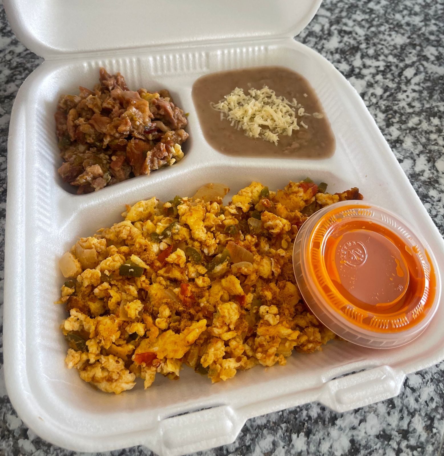 2 Huevos revueltos con pico de gallo más un guiso y frijoles.