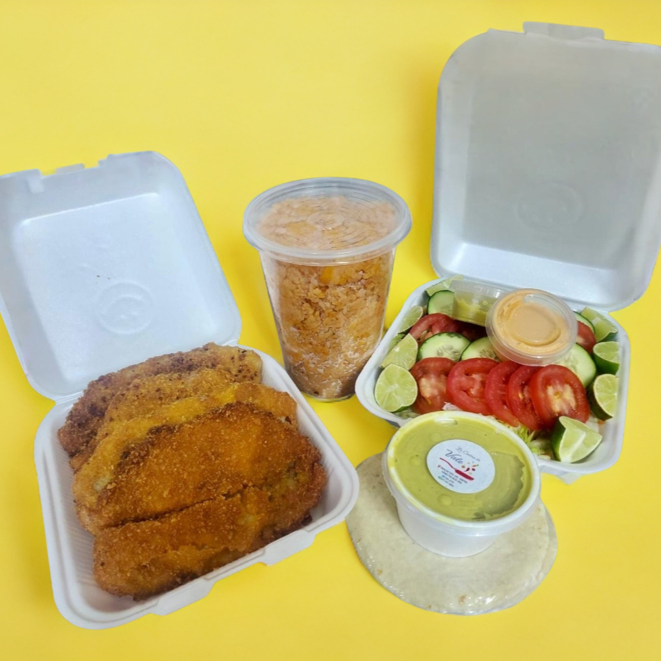 4 Filetes Empanizados+ 1 Lt Ensalada Verde + Arroz 1 Lt + Tortillas + Salsa