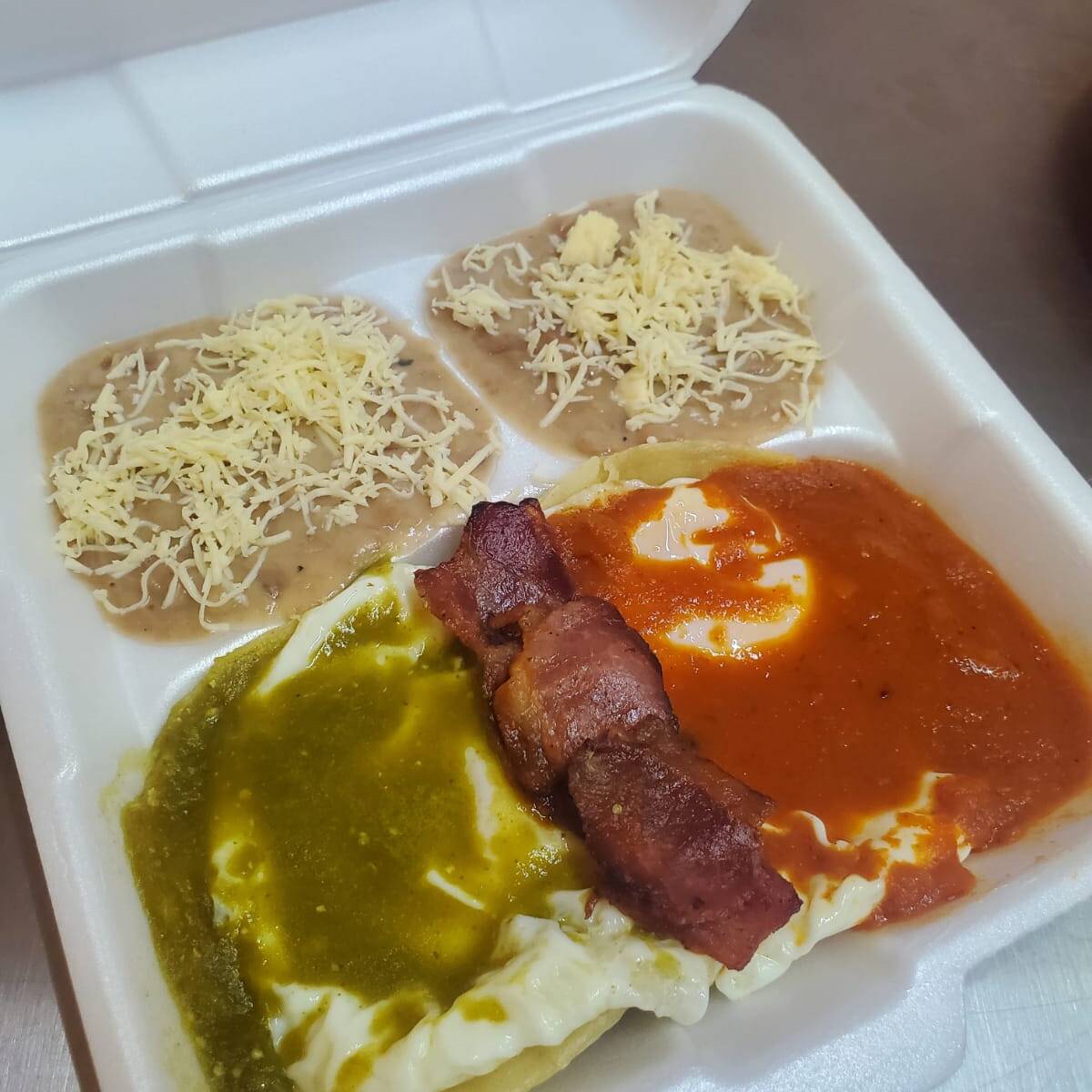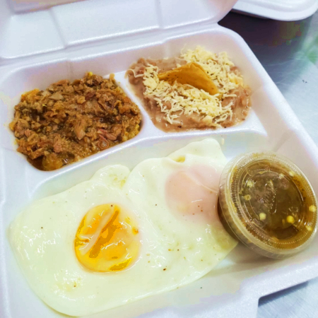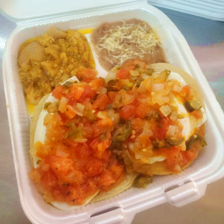 2 Huevos estrellados, bañados en salsa ranchera, montados en 2 tortillas doraditas más un guiso y frijoles.
