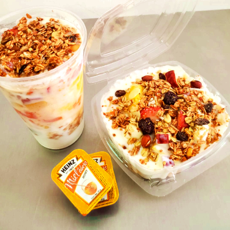 Deliciosa combinación de frutas con yogurt, miel y el cereal de tu elección.