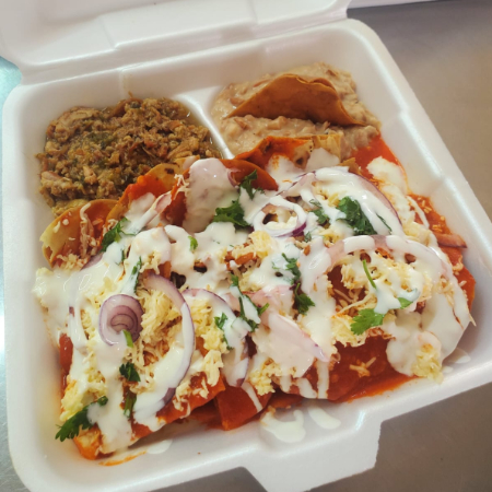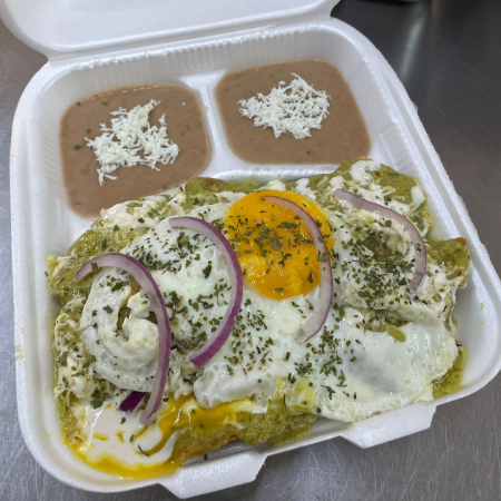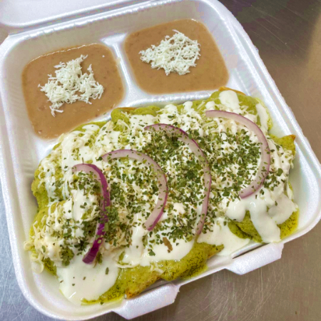 Base de tortilla en salsa verde o roja, con queso chihuahua, crema, cebolla morada y cilantro, acompañados de frijoles refritos.
