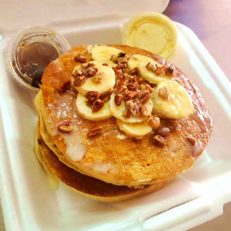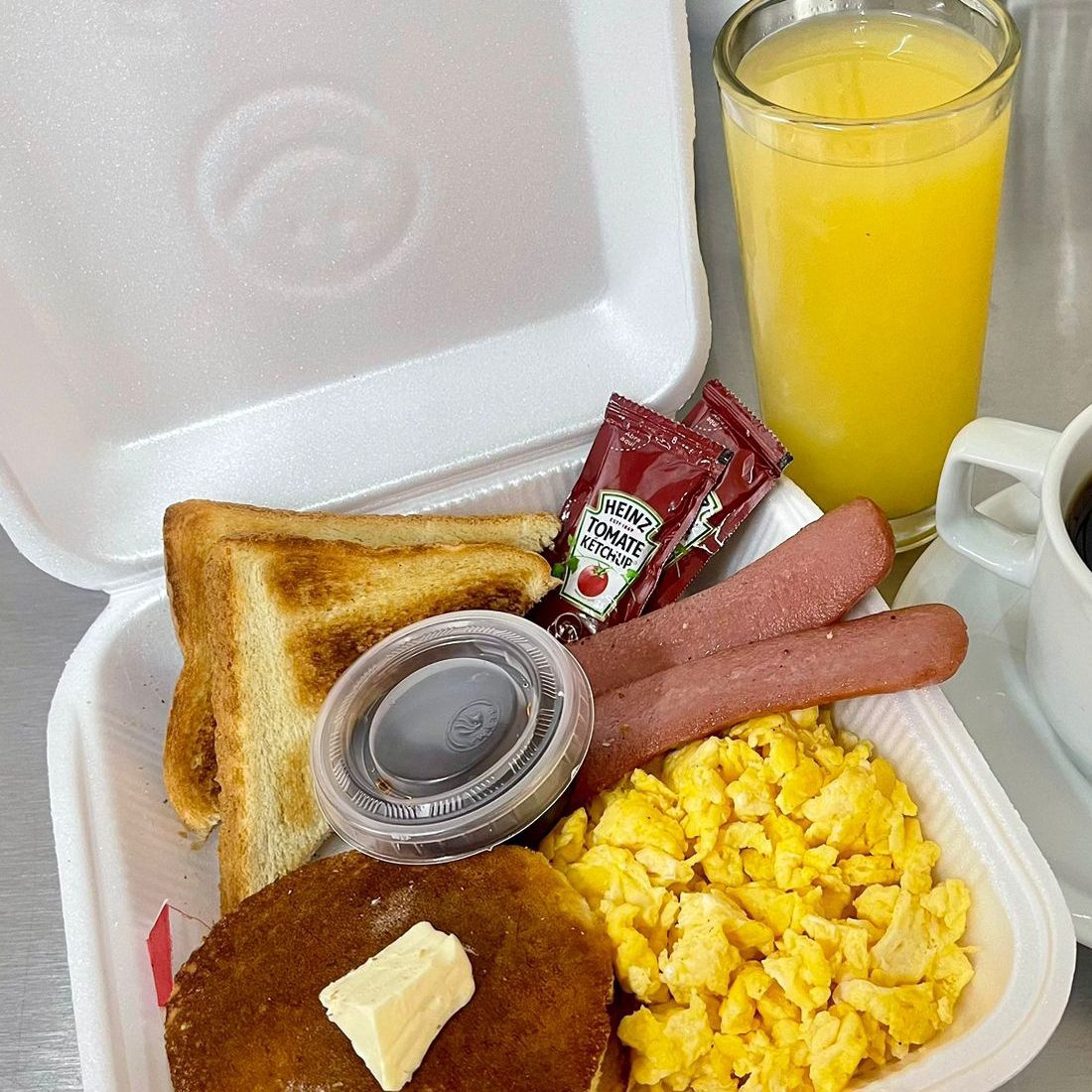 Jugo de Naranja de 500 ml, 2 huevos estrellados, salchicha de cerdo, pan tostado, 2 pancakes de mantequilla.