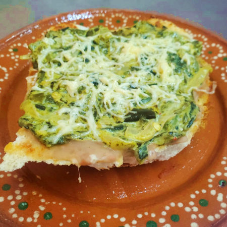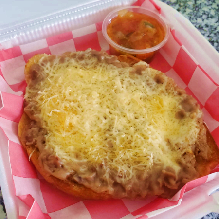 Con queso panela o chihuahua, hojas de lechuga, tomate, cebolla y chile.