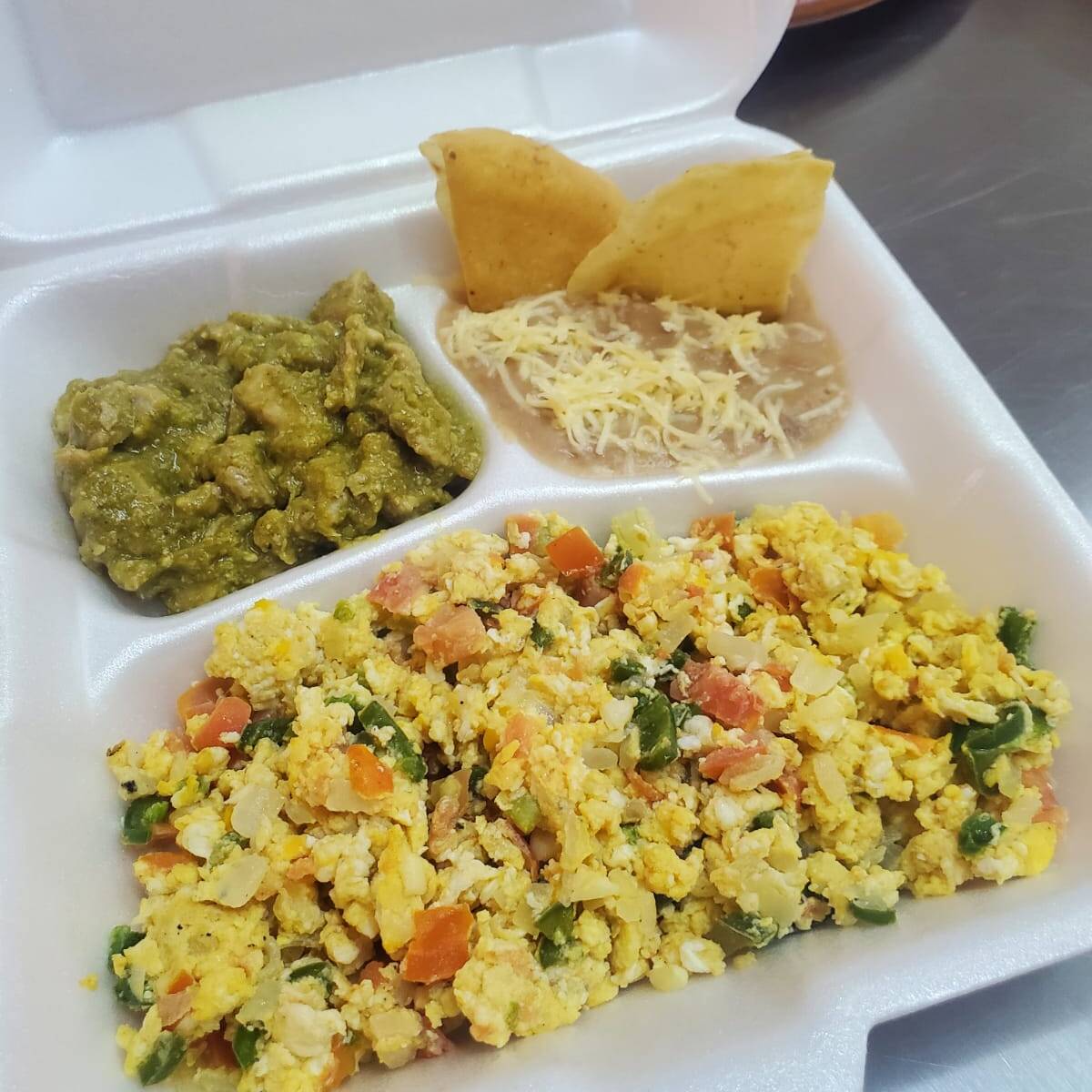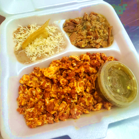 2 Huevos revueltos con machaca, más un guiso y frijoles.