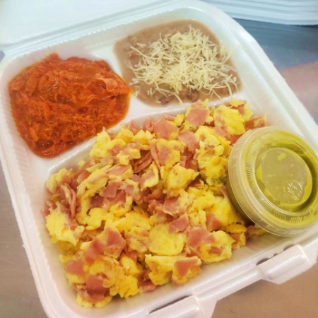 2 Huevos revueltos con jamón más un guiso y frijoles.