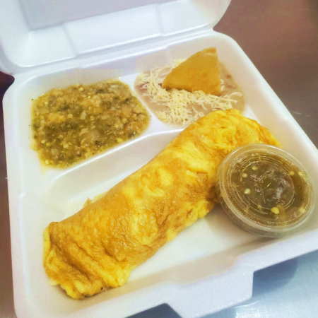 Deliciosa tortilla de huevo batido con jamón y queso, más un guiso y frijoles.