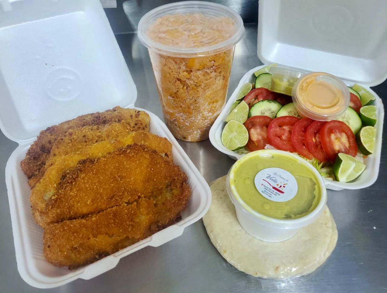 4 Filetes Empanizados+ 1 Lt Ensalada Verde + Arroz 1 Lt + Tortillas + Salsa
