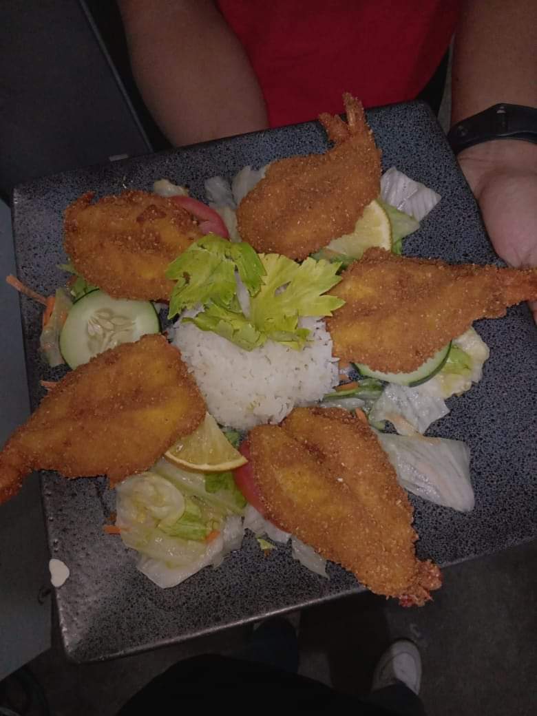 Camarones bañados en salsa de la casa, arroz blanco, ensalada y pan con mantequilla.
