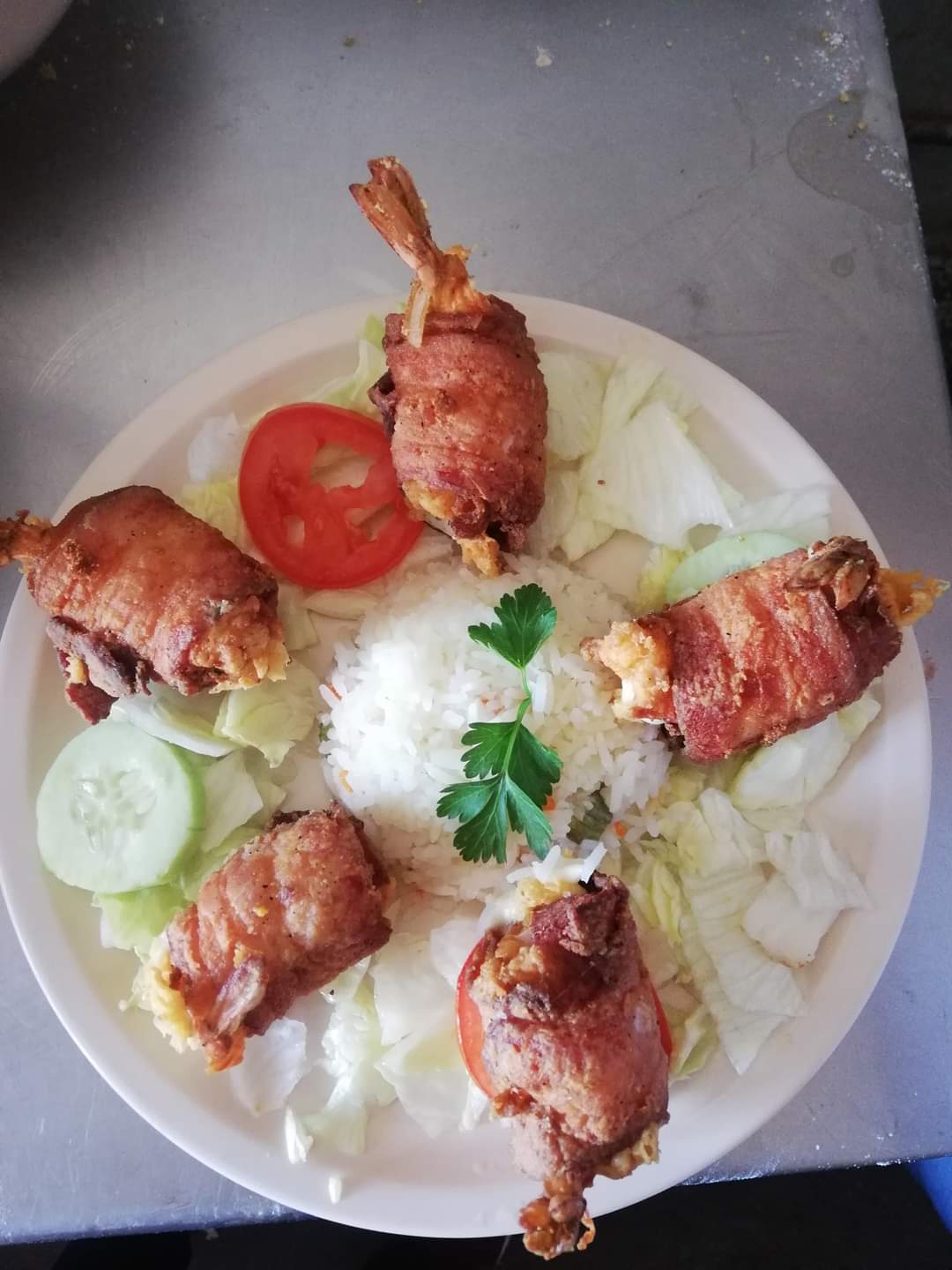 Rellenos de jamón, queso, enrollados en tocino, acompañados de arroz blanco, ensalada y pan con mantequilla.