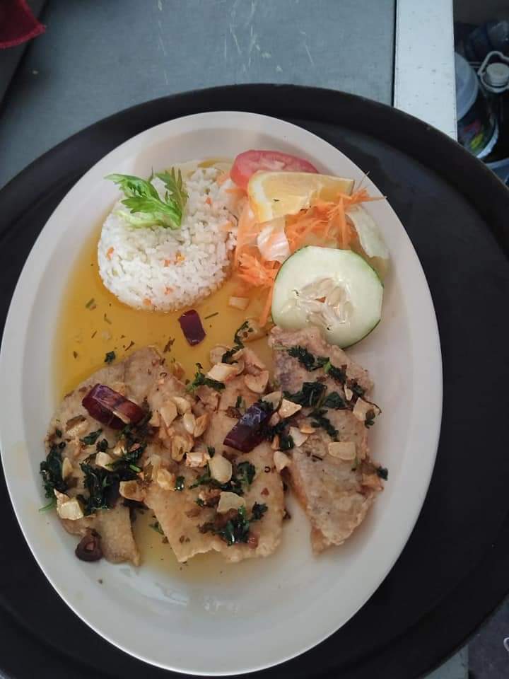 Filete frito bañado al majo de ajo acompañado de arroz blanco, ensalada y pan con mantequilla.