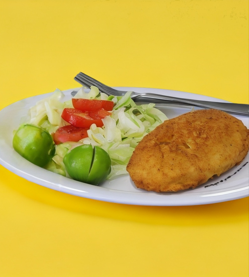 Deliciosa pechuga empanizada rellena de queso y jamón empanizada acompañado de dos guarniciones