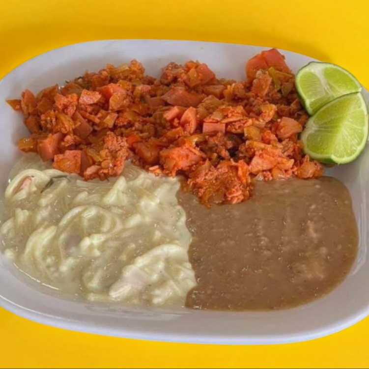 Delicioso platillo de 2 Huevos C Pico de Gallo, acompañado de frijoles y una guarnición