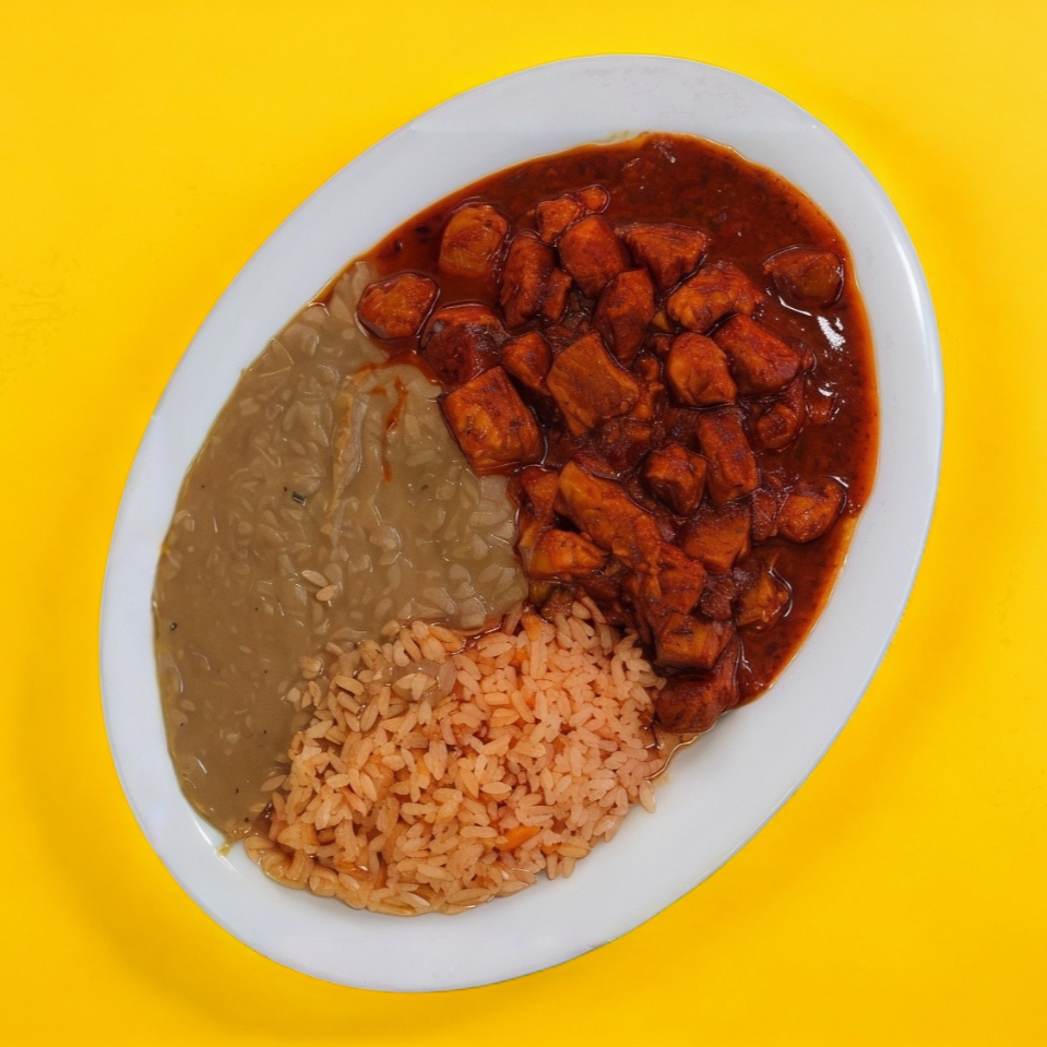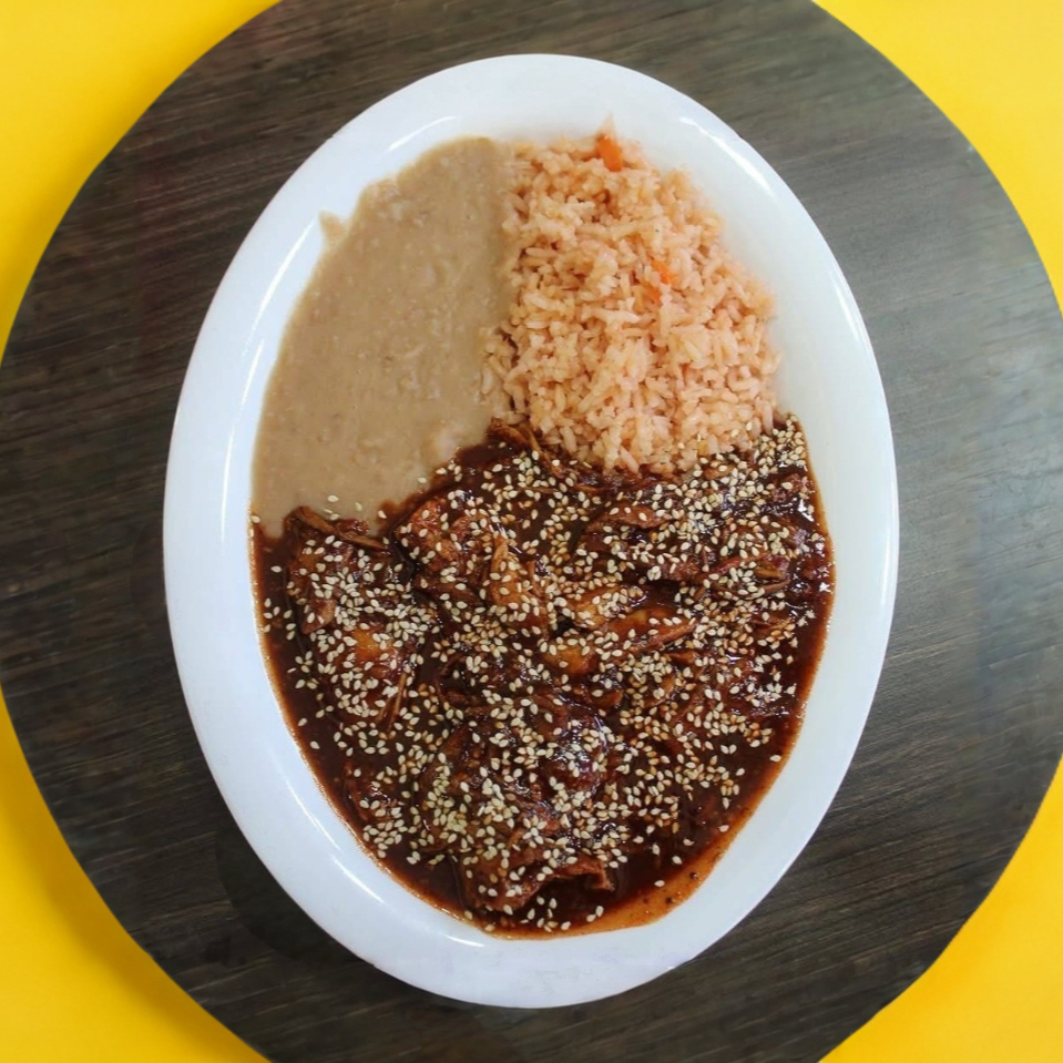 Delicioso platillo de mole acompañado de dos guarniciones