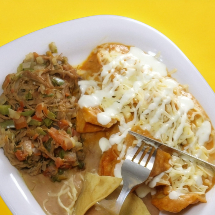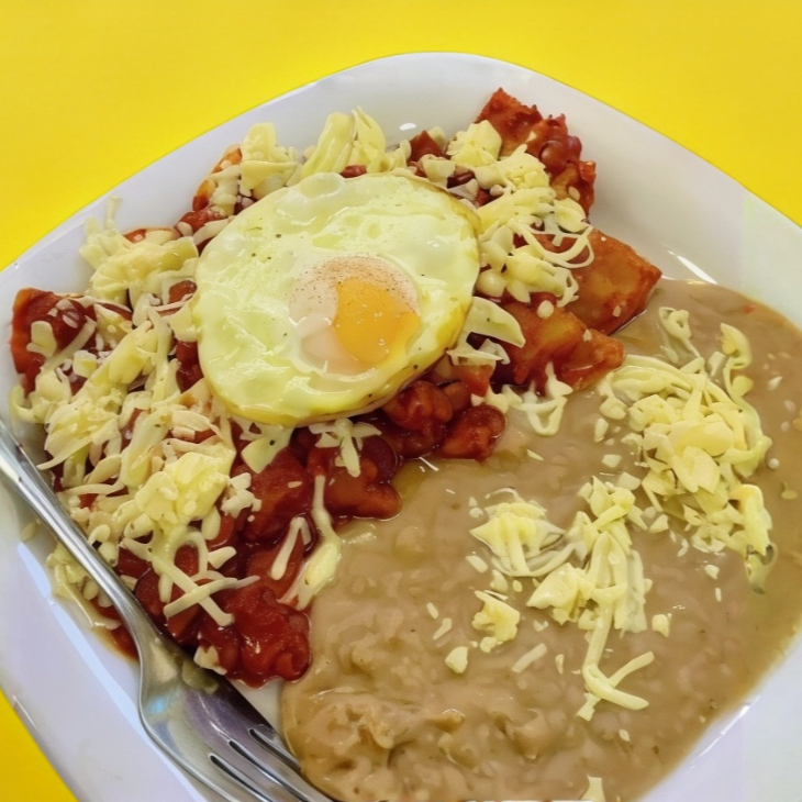 Deliciosos Chilaquiles Rojos acompañados de frijoles y una guarnición