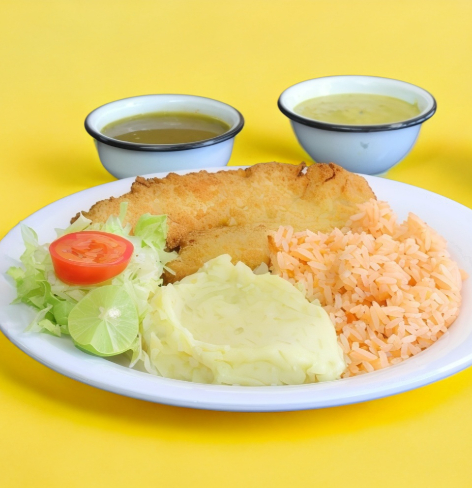 Delicioso platillo de Filete de Pescado Empanizado acompañado de 2 guarniciones