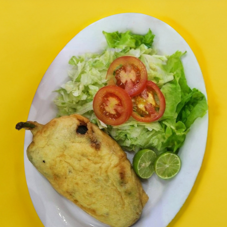 Delicioso chile relleno de queso o picadillo acompañado de dos guarniciones