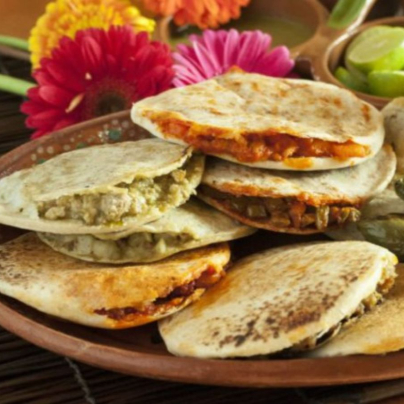 Tradicionales de maíz rellenas de guisos caseros: asado rojo, picadillo, papas verdes, huevo verde, carne con chile, frijoles, queso, chicharrón de peya, rajas poblanas con crema y queso, discada o chicharrón prensado.