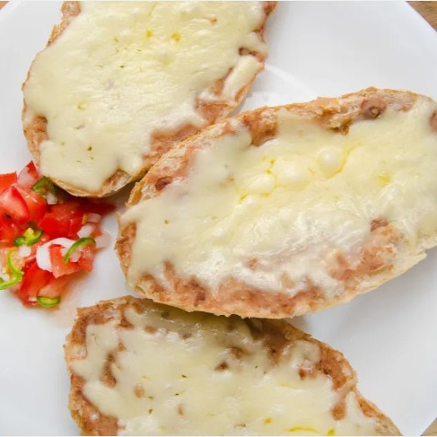 Crujiente pan francés con base de frijoles refritos y abundante queso gratinado.