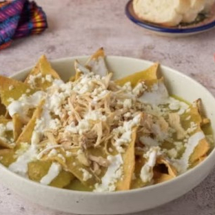 Totopos bañados en salsa verde casera, acompañados de frijoles refritos y una porción de guiso.