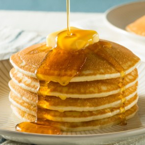 Esponjosos hot cakes servidos con fruta fresca de temporada y miel de maple.