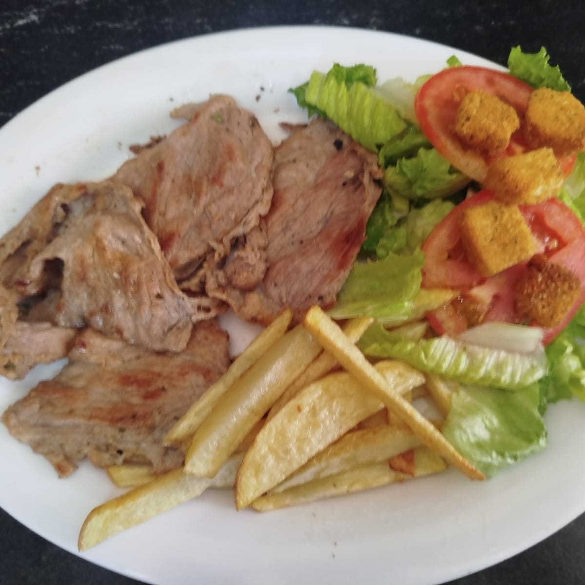 Corte de bistec cocinado a la plancha en su punto, acompañado de ensalada y papas fritas.