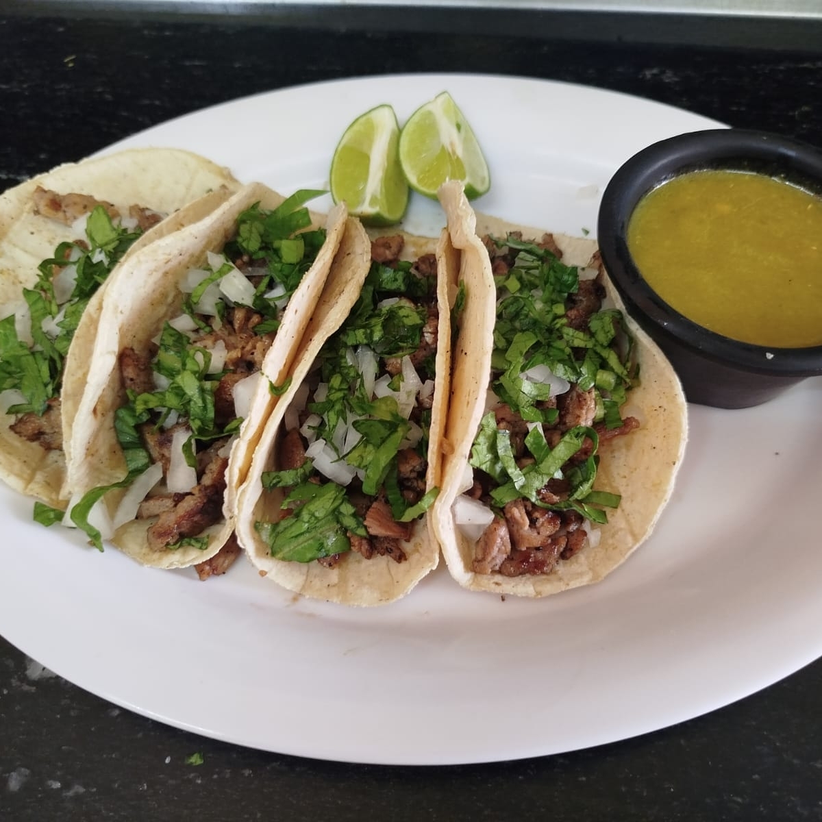 Orden de 4 tacos de bistec suave y bien sazonado, servidos en tortilla caliente.