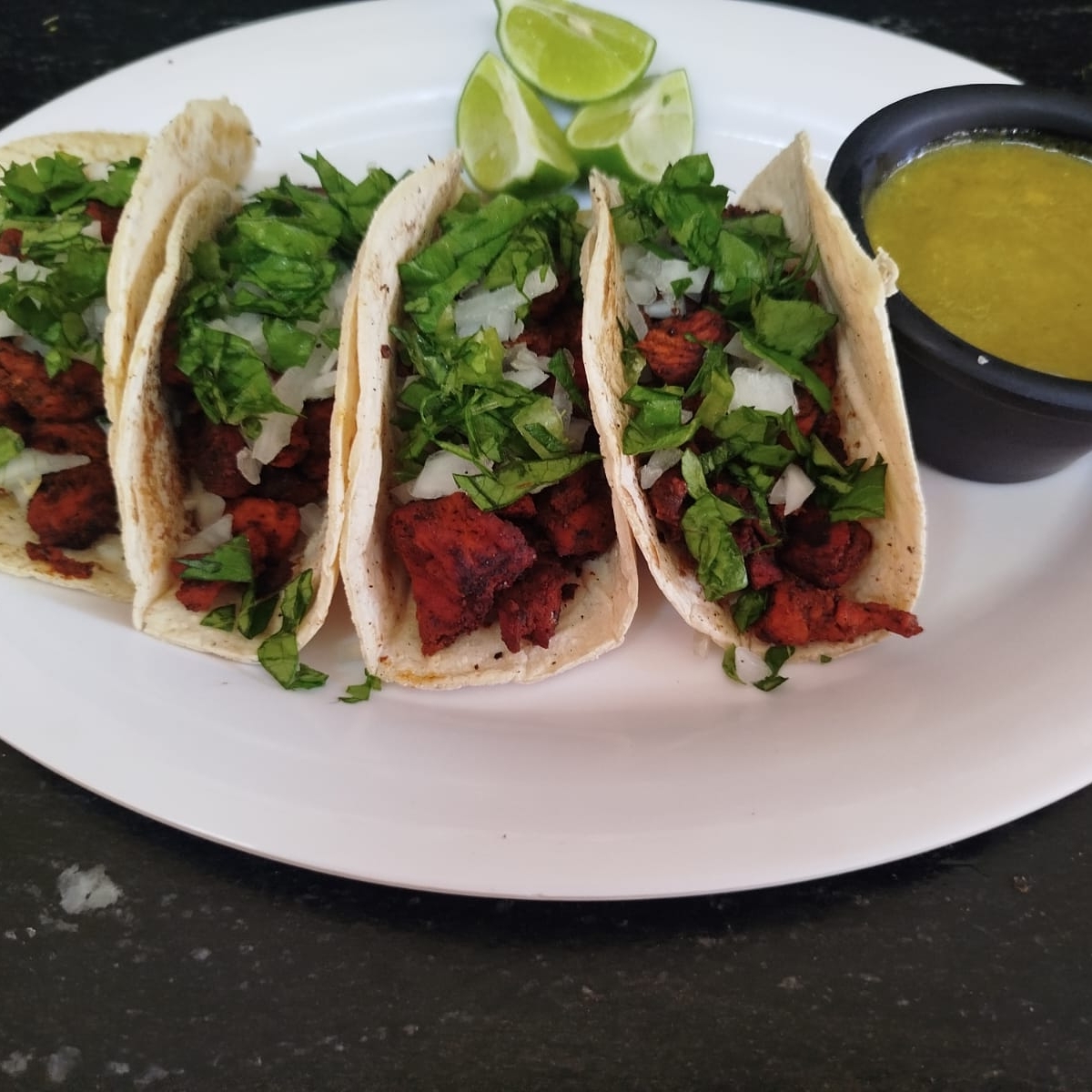 Orden de 4 tacos de carne adobada con la receta secreta de la casa, llenos de sabor.
