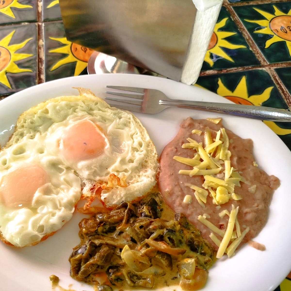 Desayuno de campeones: chilaquiles con frijoles, guiso y dos huevos estrellados encima.