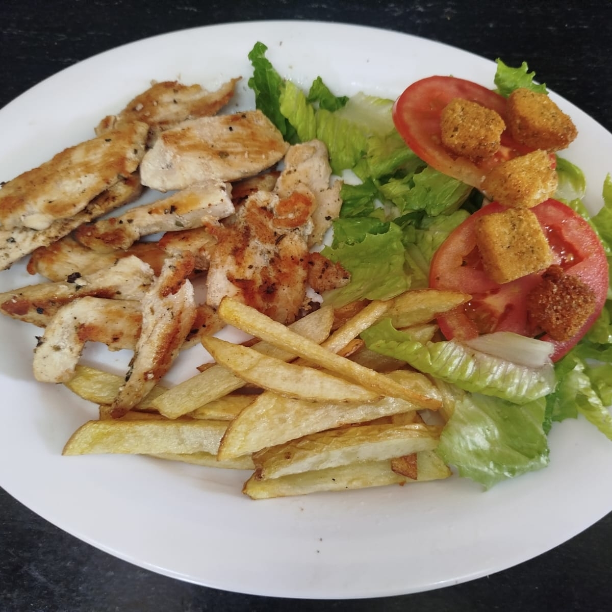 Jugosa pechuga de pollo cocinada a la plancha, servida con ensalada fresca y papas fritas.