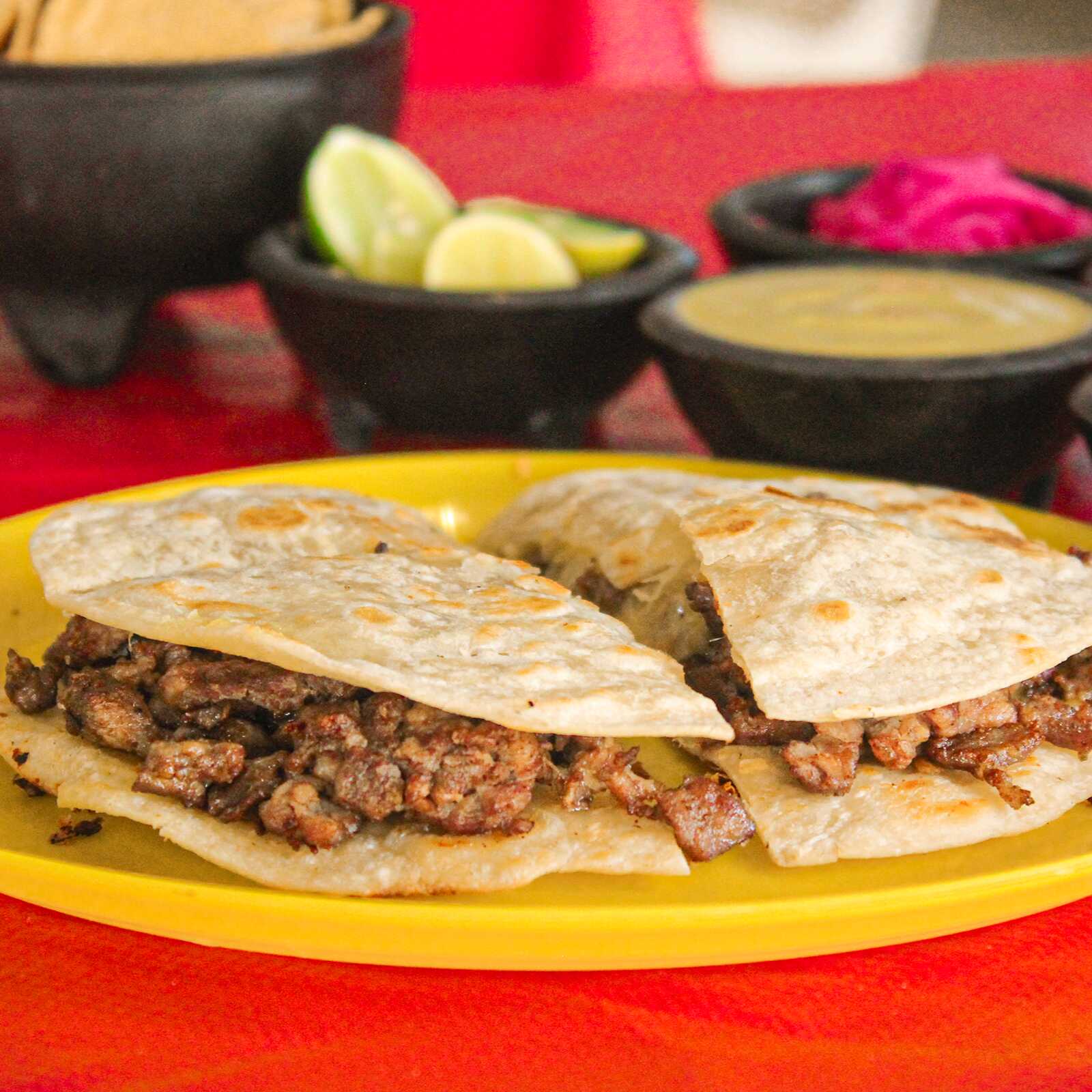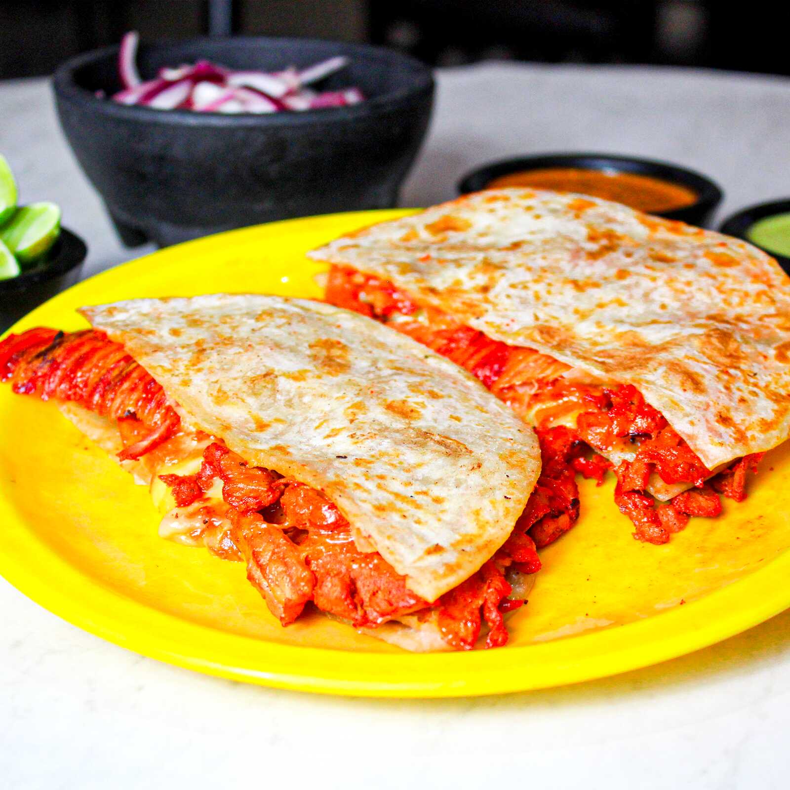 Quesadilla con 2 tortillas de harina rellena de pastor.