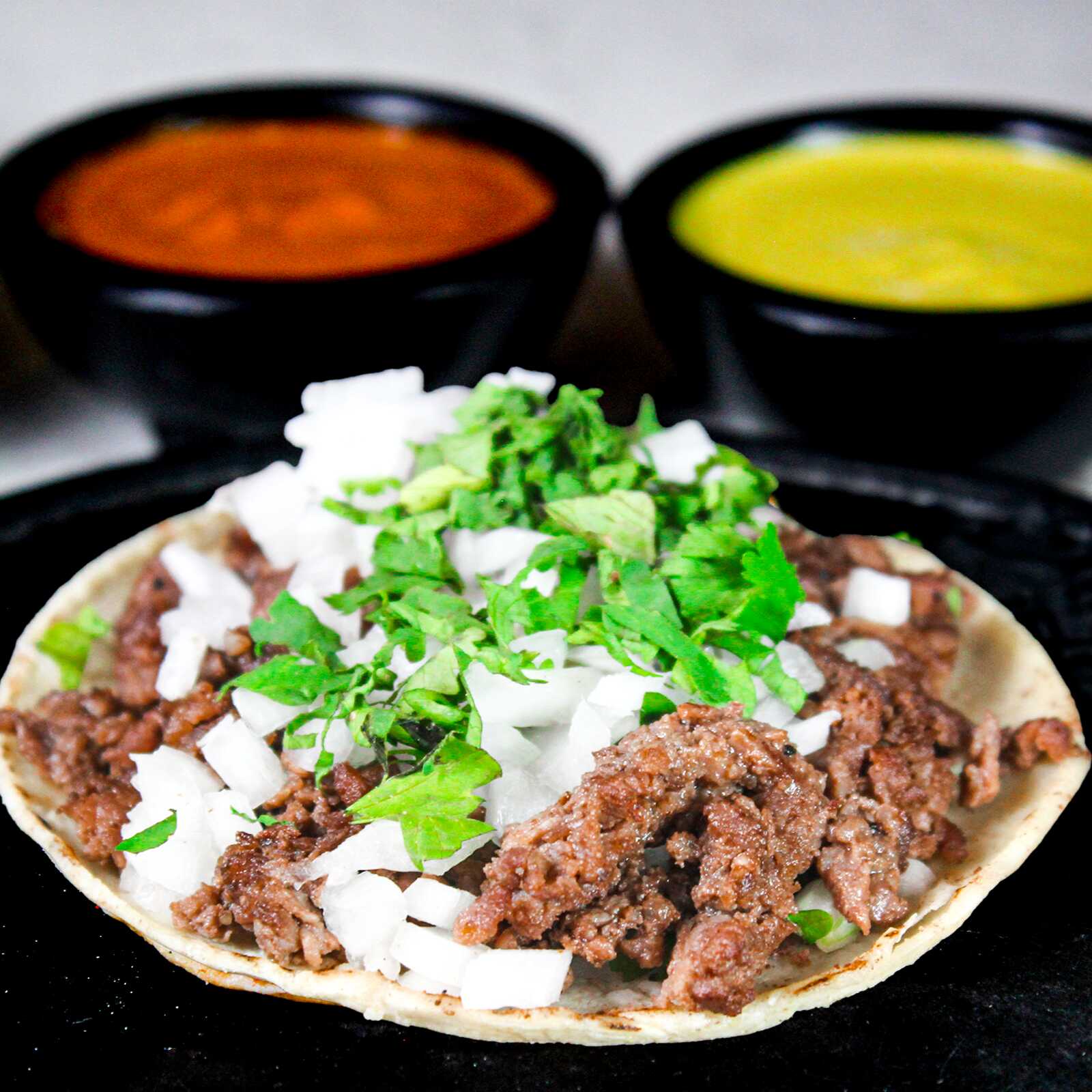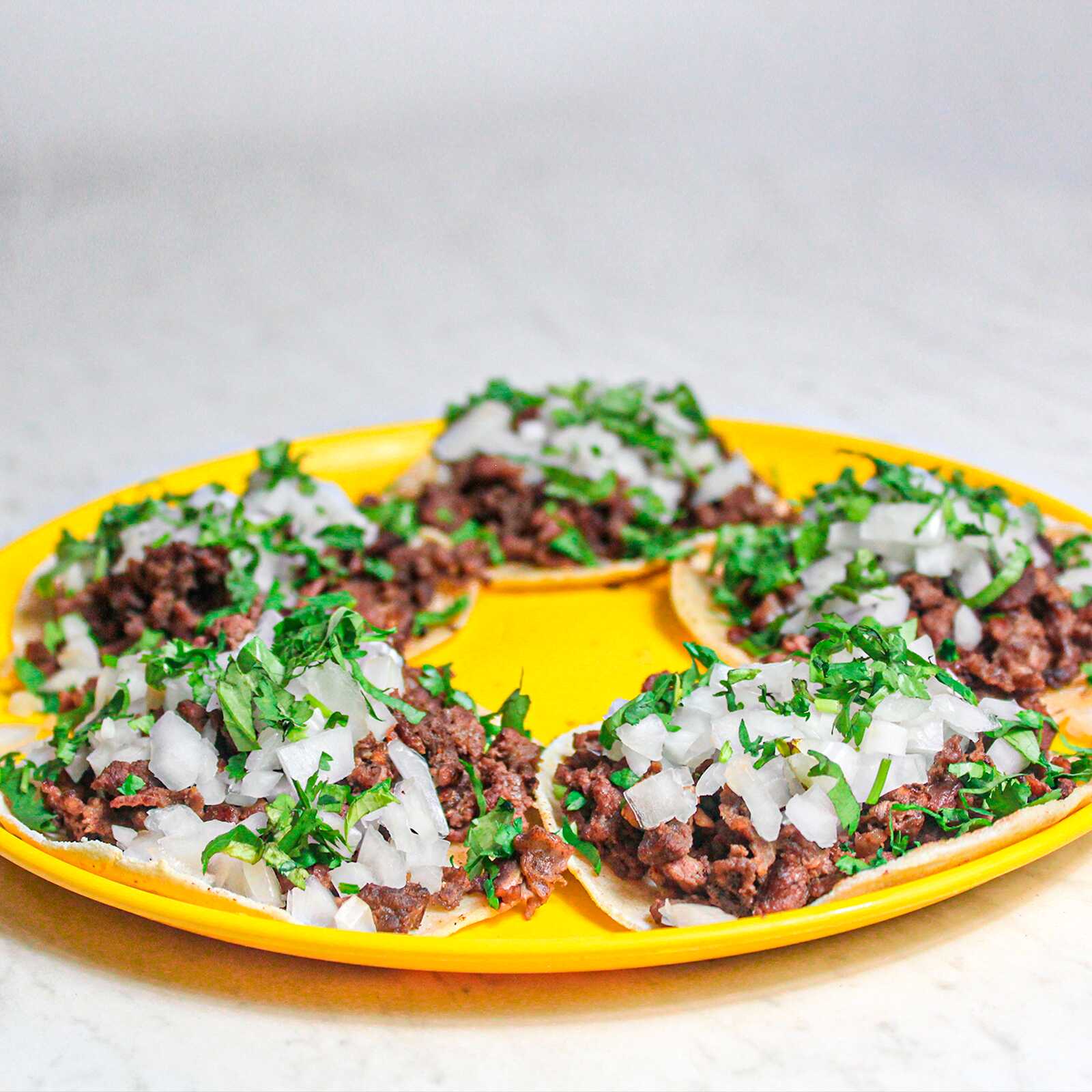 Orden con 5 tacos de bistec en tortilla de maíz.