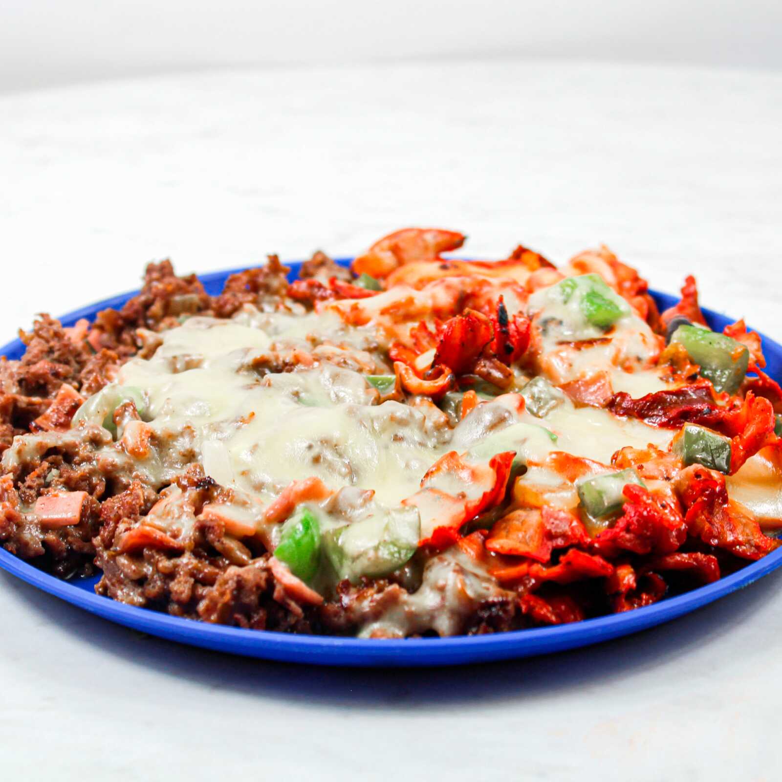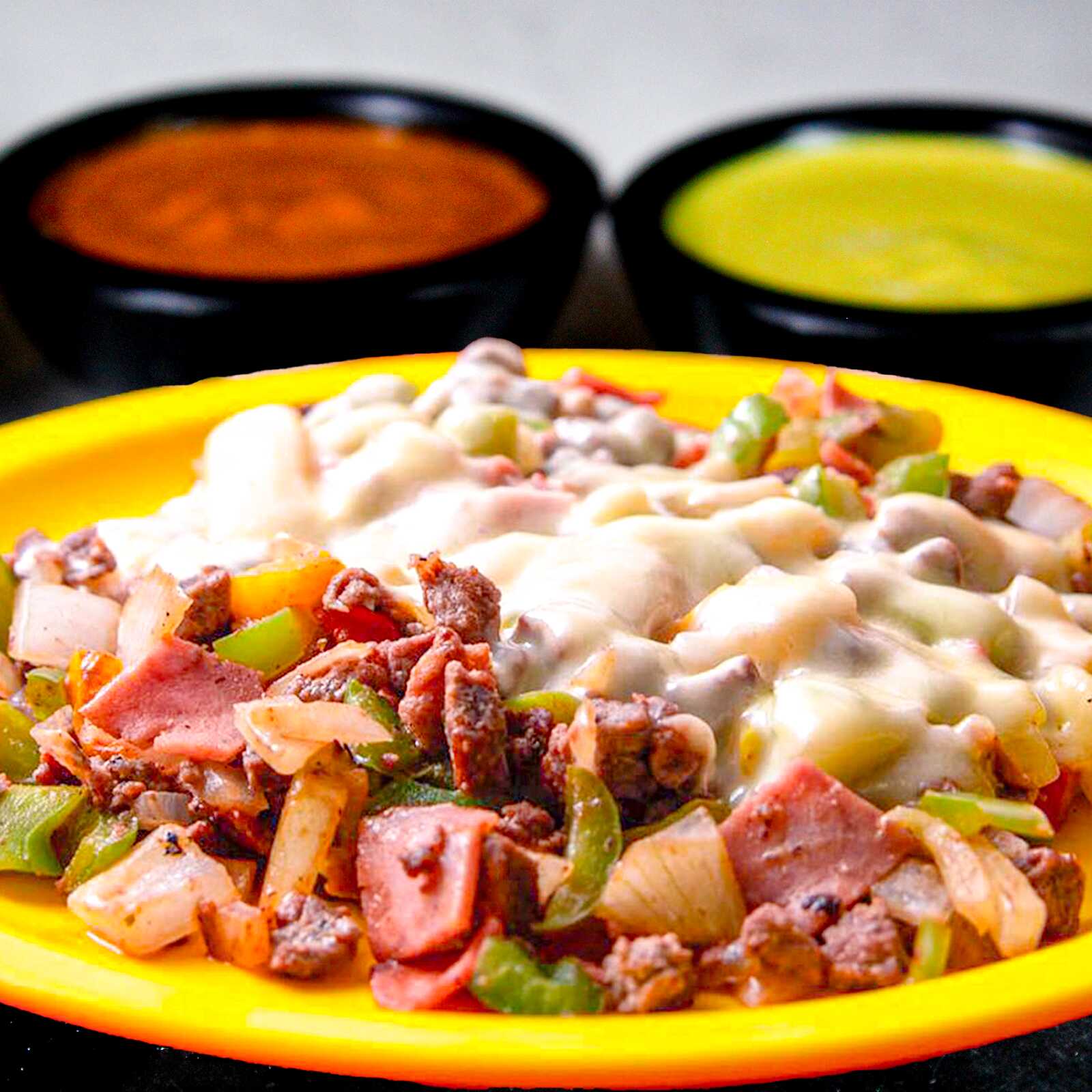 350 gr de alambre hecho con bistec, chile morrón, queso, cebolla, jamón y tortillas.
