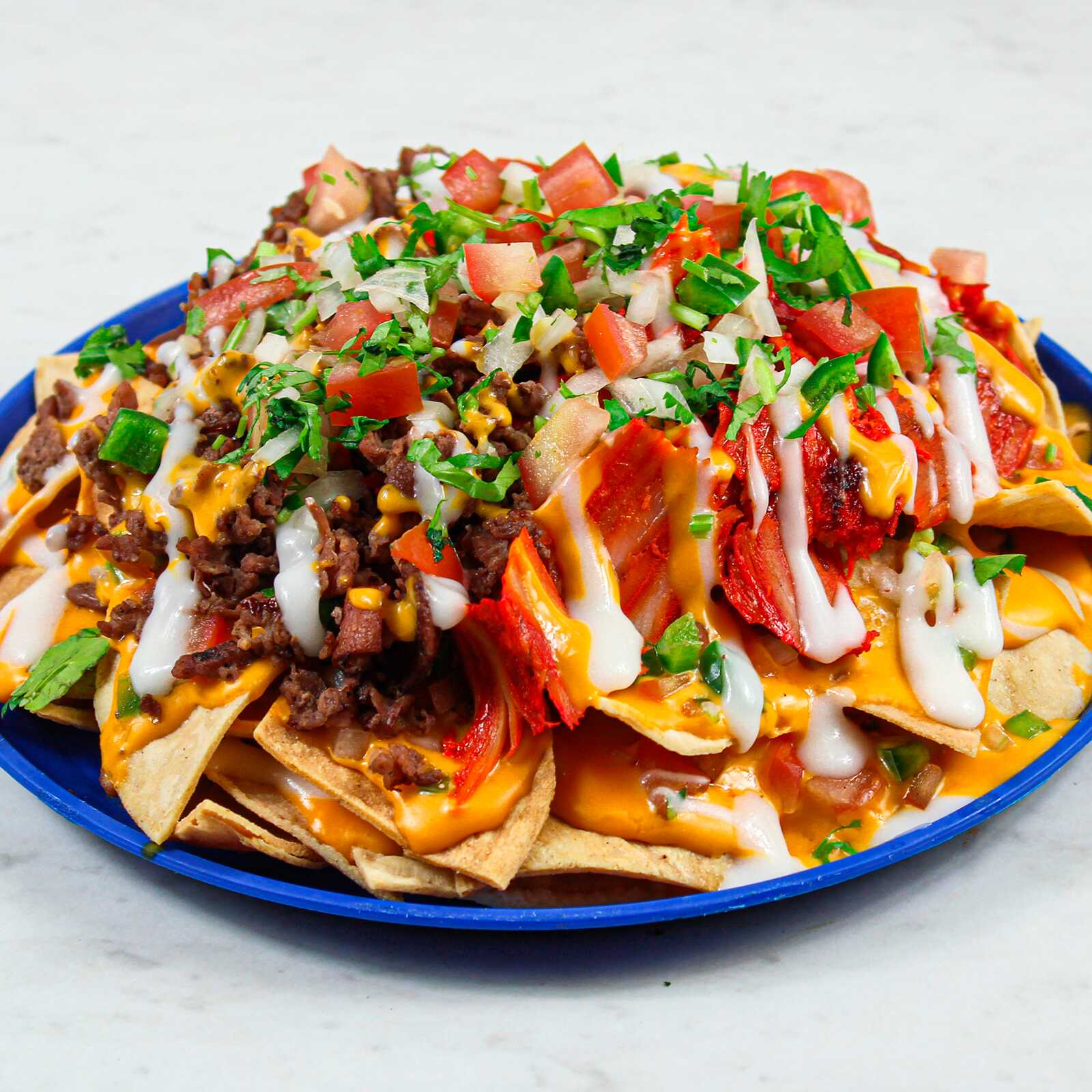 Nachos con queso amarillo, crema, pico de gallo y carne de tu elección