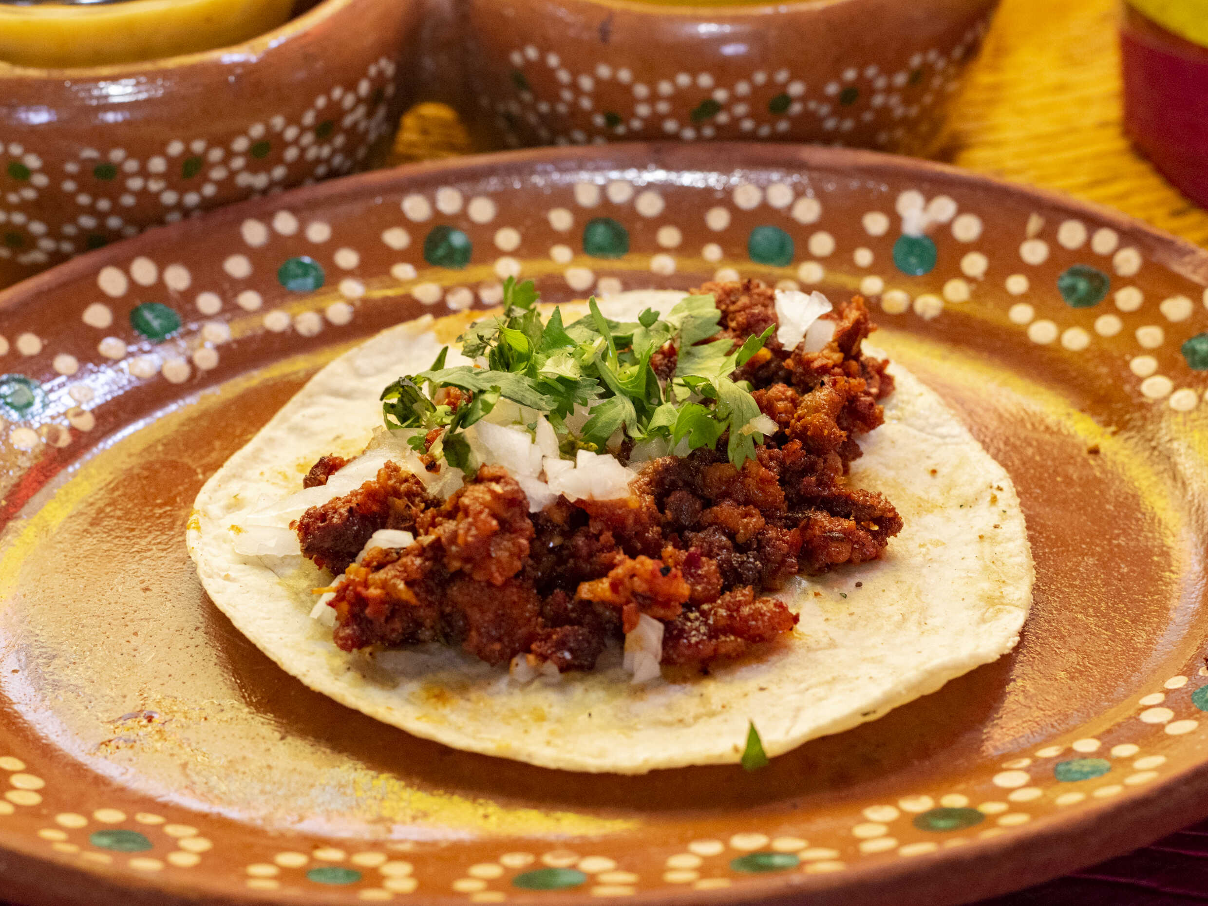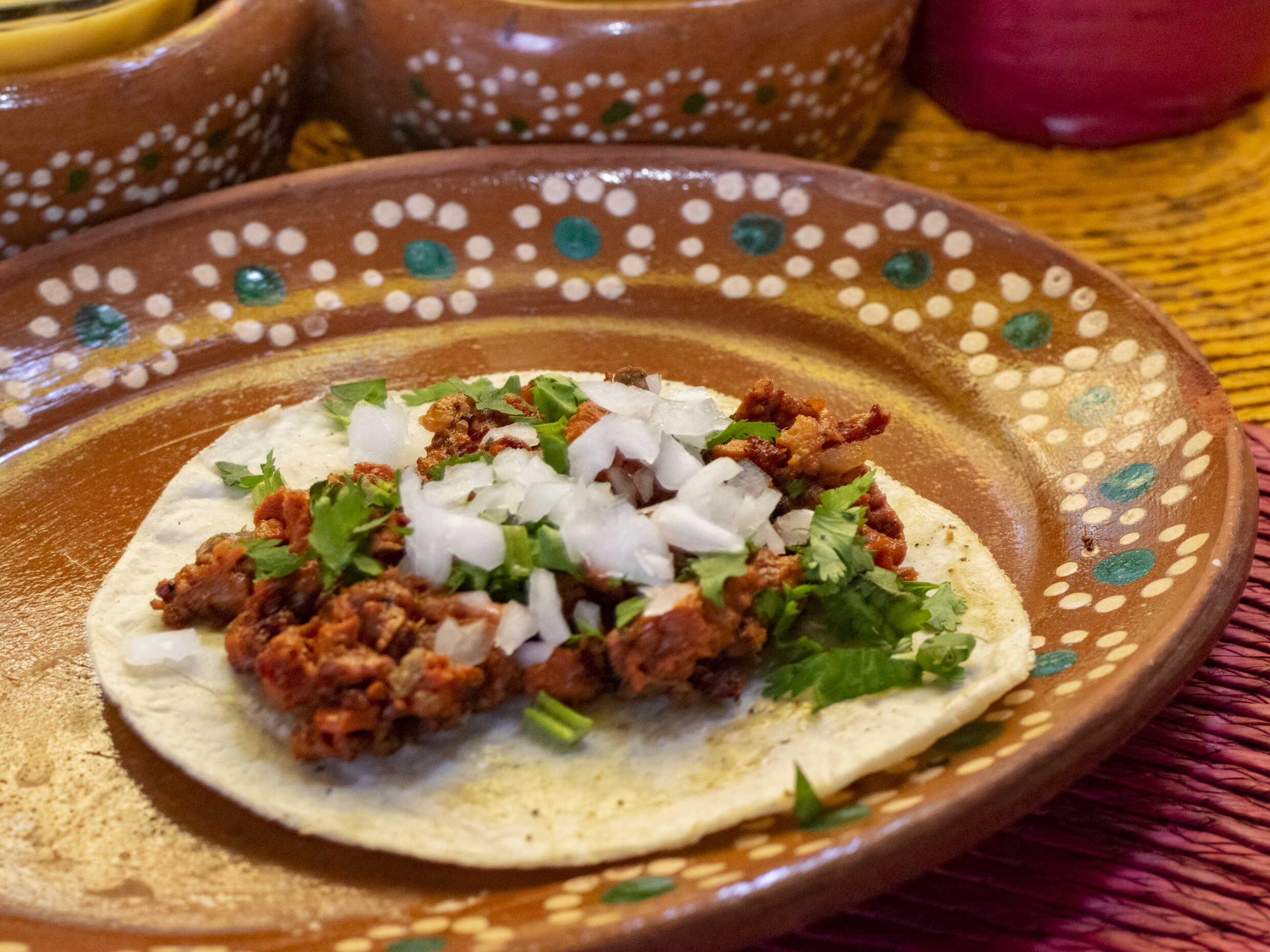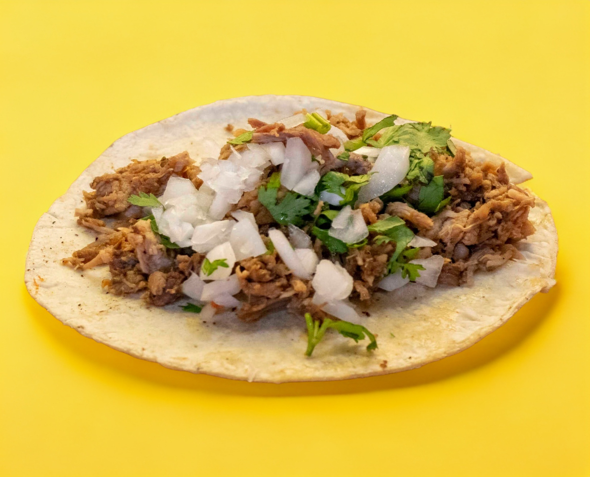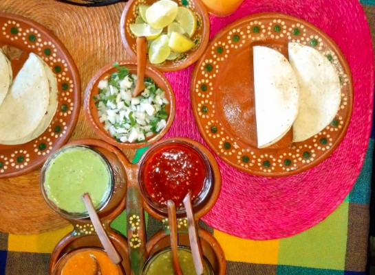 Acompañado cebolla con cilantro, limon, salsa y tortillas